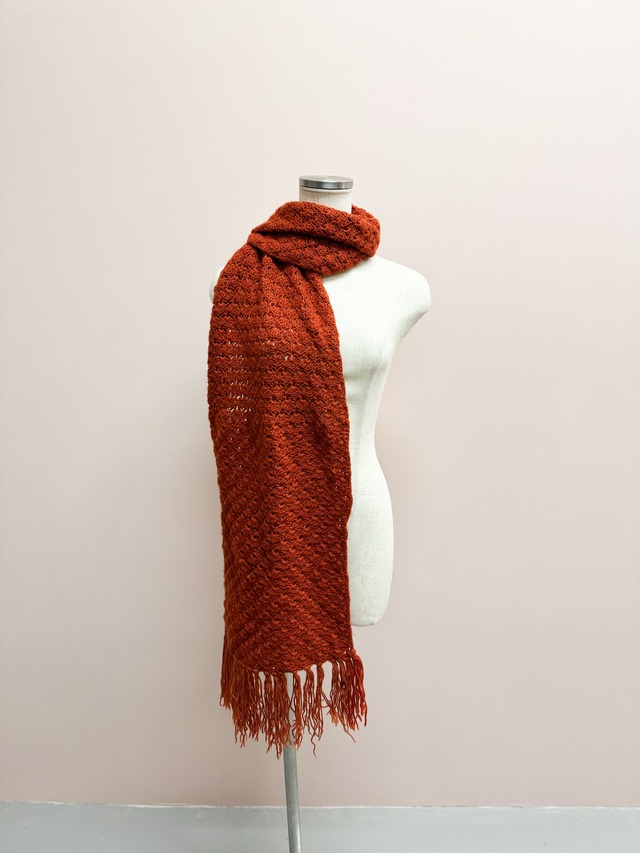 長さ:約205cm(フリンジ含む) 幅:約27cm ※ 平置き採寸 material 素材表記タグ無し condition USED . 絶妙な色合いがとても可愛いマフラーです。 一見ありそうで、実はなかなか出会えない色。 古着として見つけられたこと自体が嬉しくなるような ちょうど良いレンガ色です。 赤みが強すぎずブラウンに寄りすぎることもないため 顔まわりがくすみにくく 血色よく見せてくれる印象があります。 マフラーはどうしても脇役になりがちですが このアイテムは巻くだけで装い全体の完成度を ぐっと引き上げてくれる存在。 コーディネートに足すというより 土台を整えてくれるような感覚に近いと思います。 ベーシックな色合いはもちろん 少し色のあるアウターとも相性が良いところも 安心できるポイントだと思います。 こっくりとしたブラウン寄りのレンガ色で 流行に左右されにくく、それでいてちゃんと可愛い。 新品ではなかなか出せない この質感と色の深さも古着ならではです。 コンディションも良好で ダメージは見受けられません。 安心して日常に取り入れていただける状態です。 長く寄り添ってくれるマフラーをお探しの方に 前向きにご覧いただけたら嬉しいです。 ご購入前に必ずご利用規約をお読みください。 https://monne.theshop.jp/p/00001 .