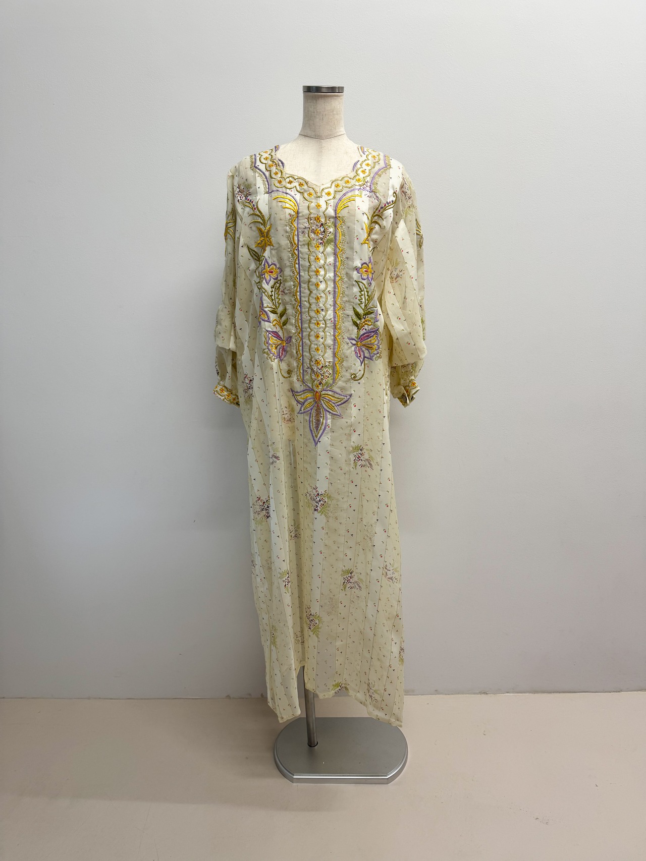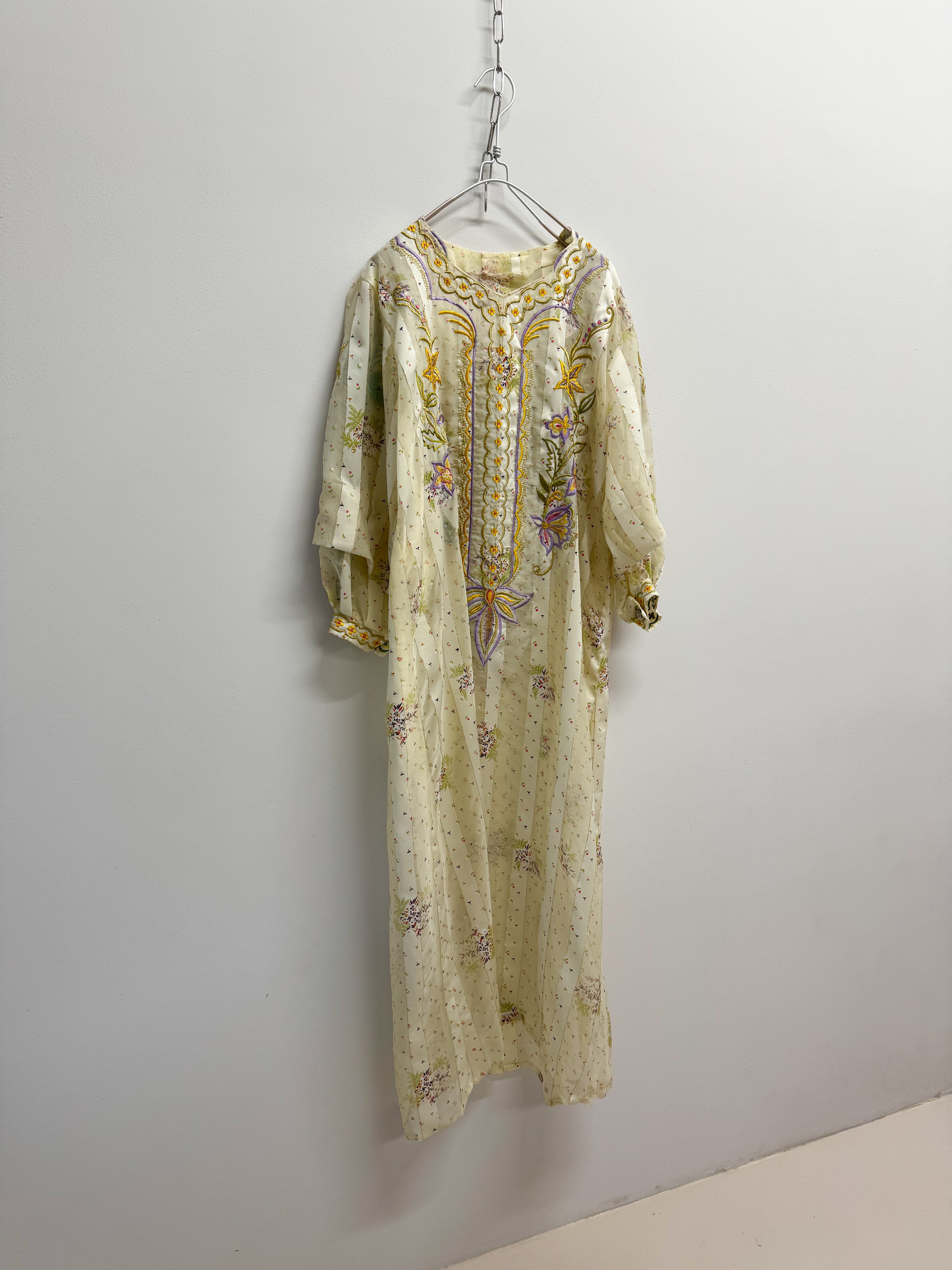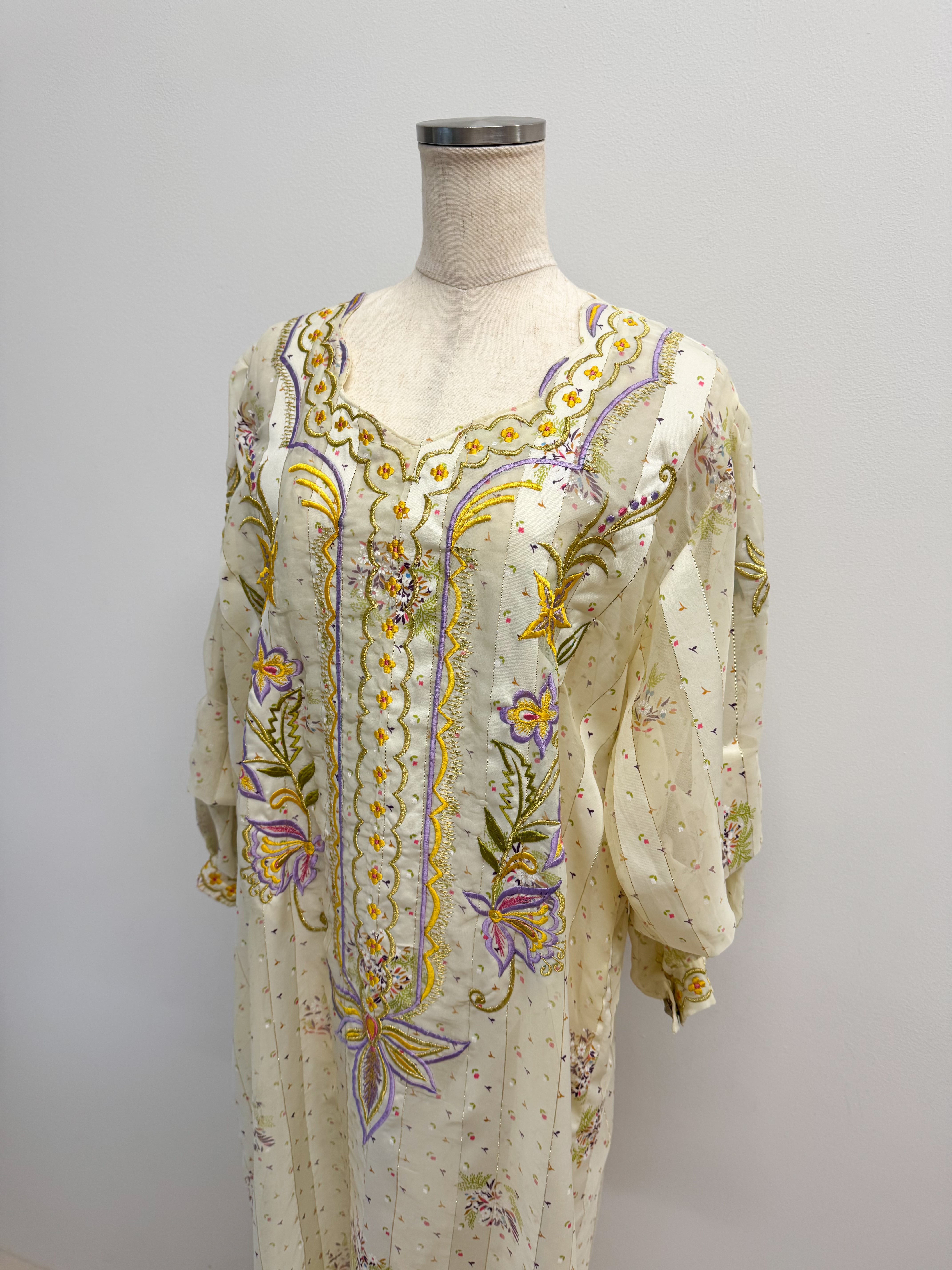 全体に施された刺繍が非常に華やかで、デコラティブな雰囲気が魅力的な1着。