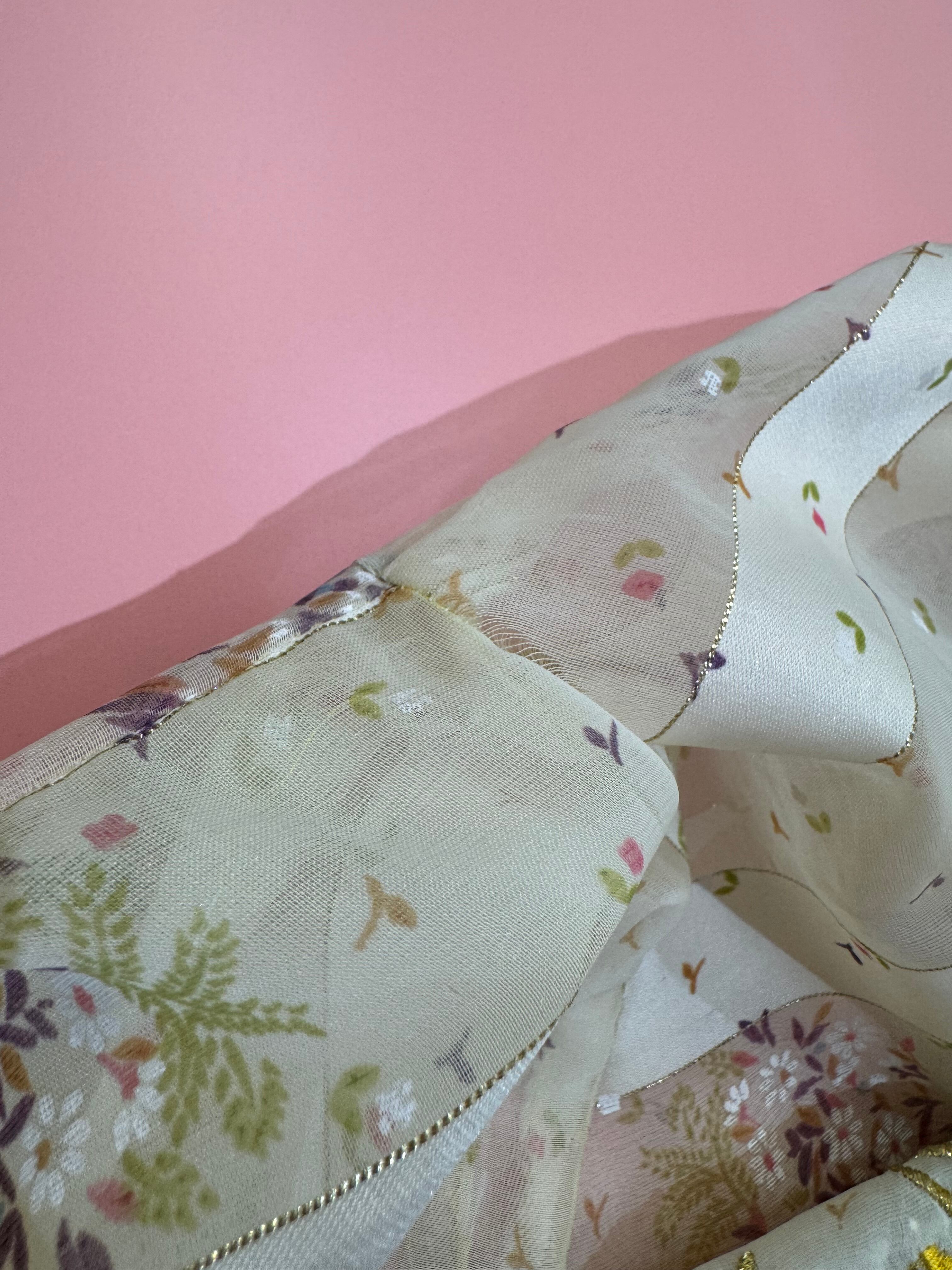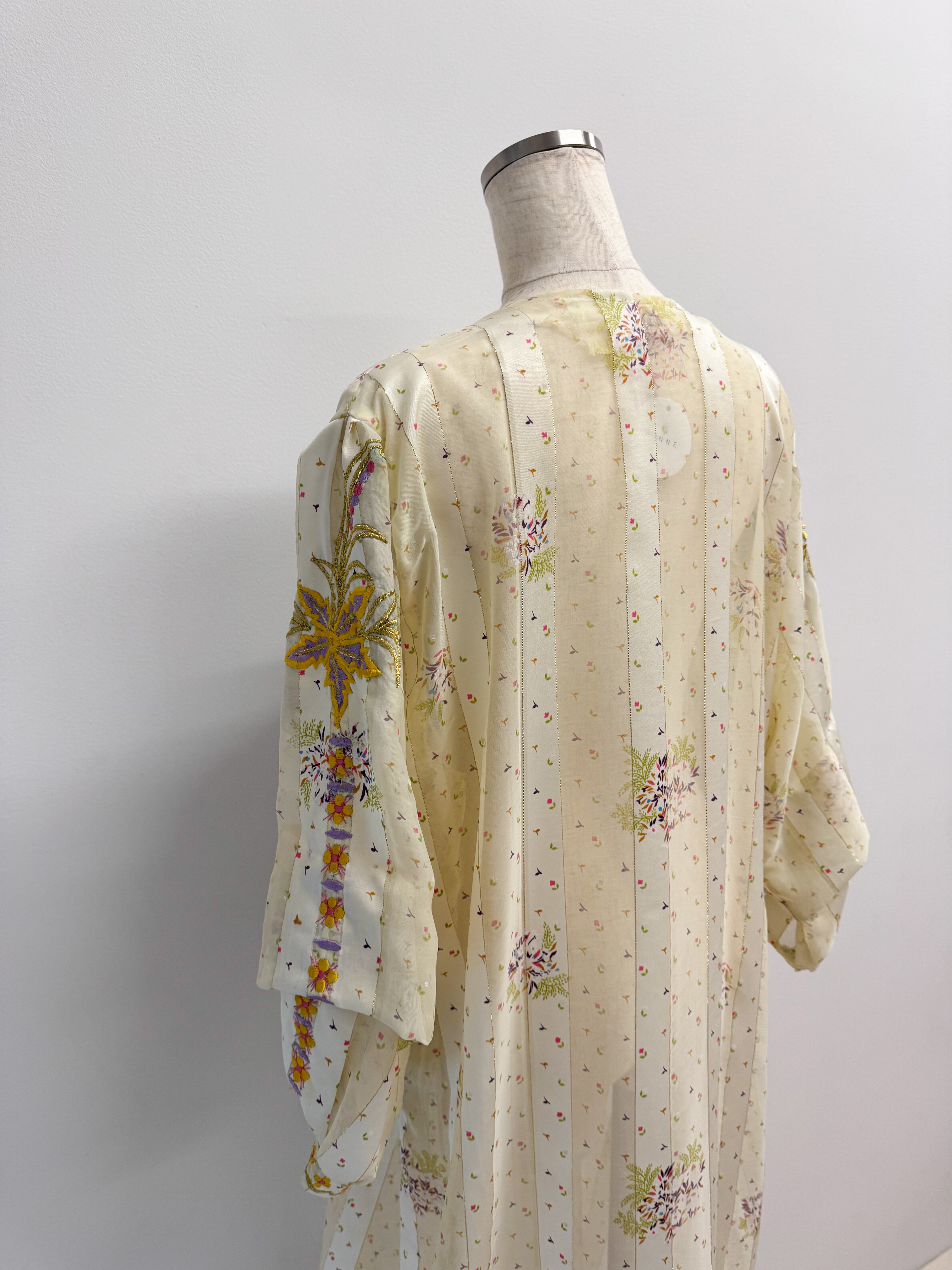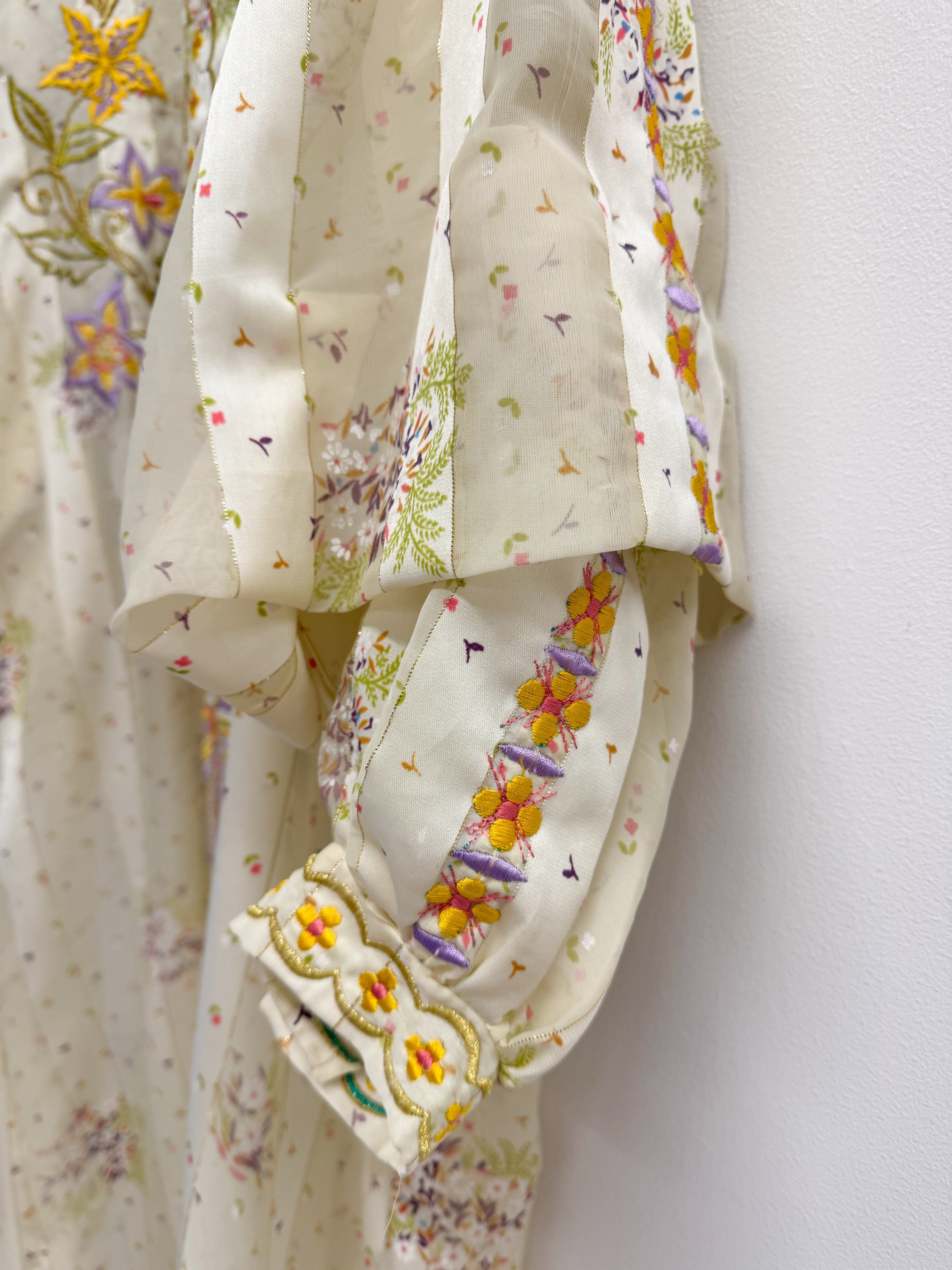 ベースの生地には小花柄のプリントが全面に施されており、刺繍の繊細さとは対照的に、ポップで軽やかなイラスト調のデザインです。異なる表現が絶妙に融合しており、刺繍とプリントのコントラストが、このワンピースの面白さだと思いました。