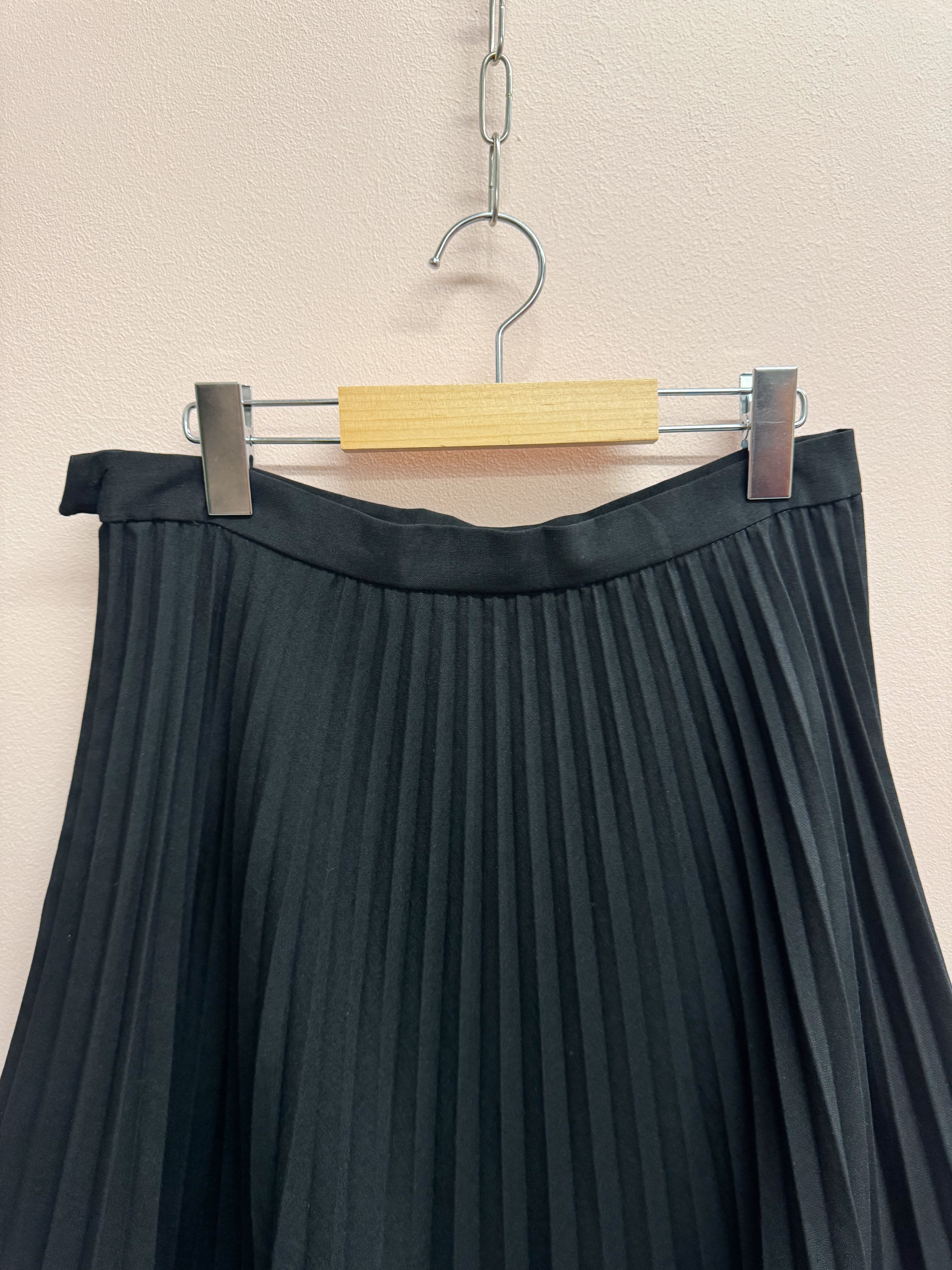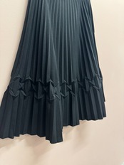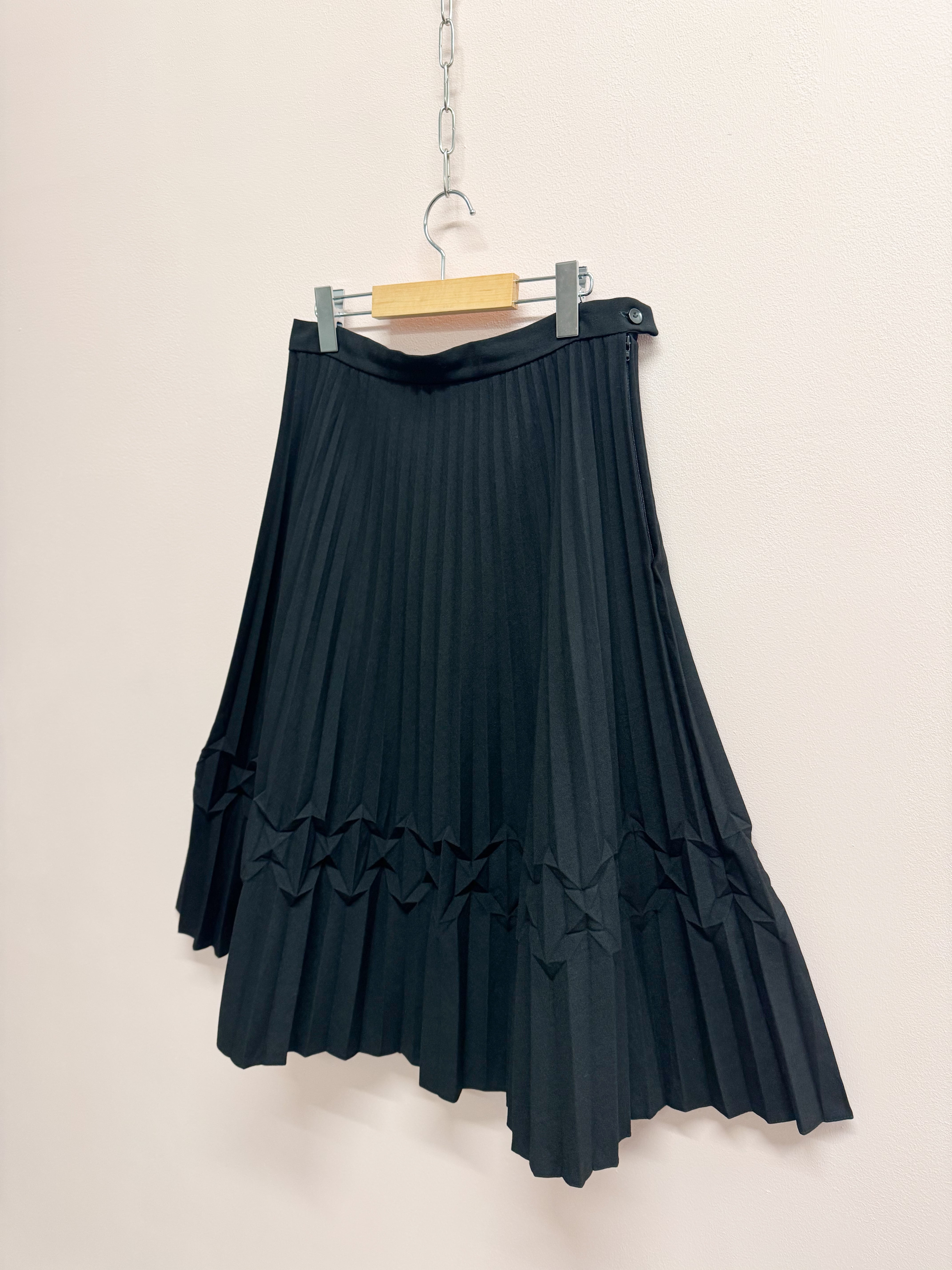 綺麗なプリーツが印象的で、変形デザインが加わることによってシンプルながらも建築的な要素を感じさせるスカートです。
