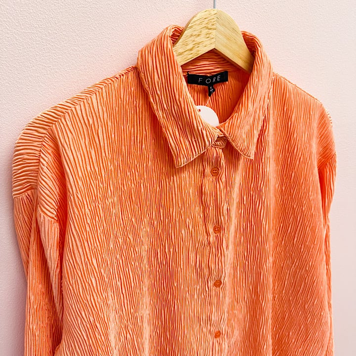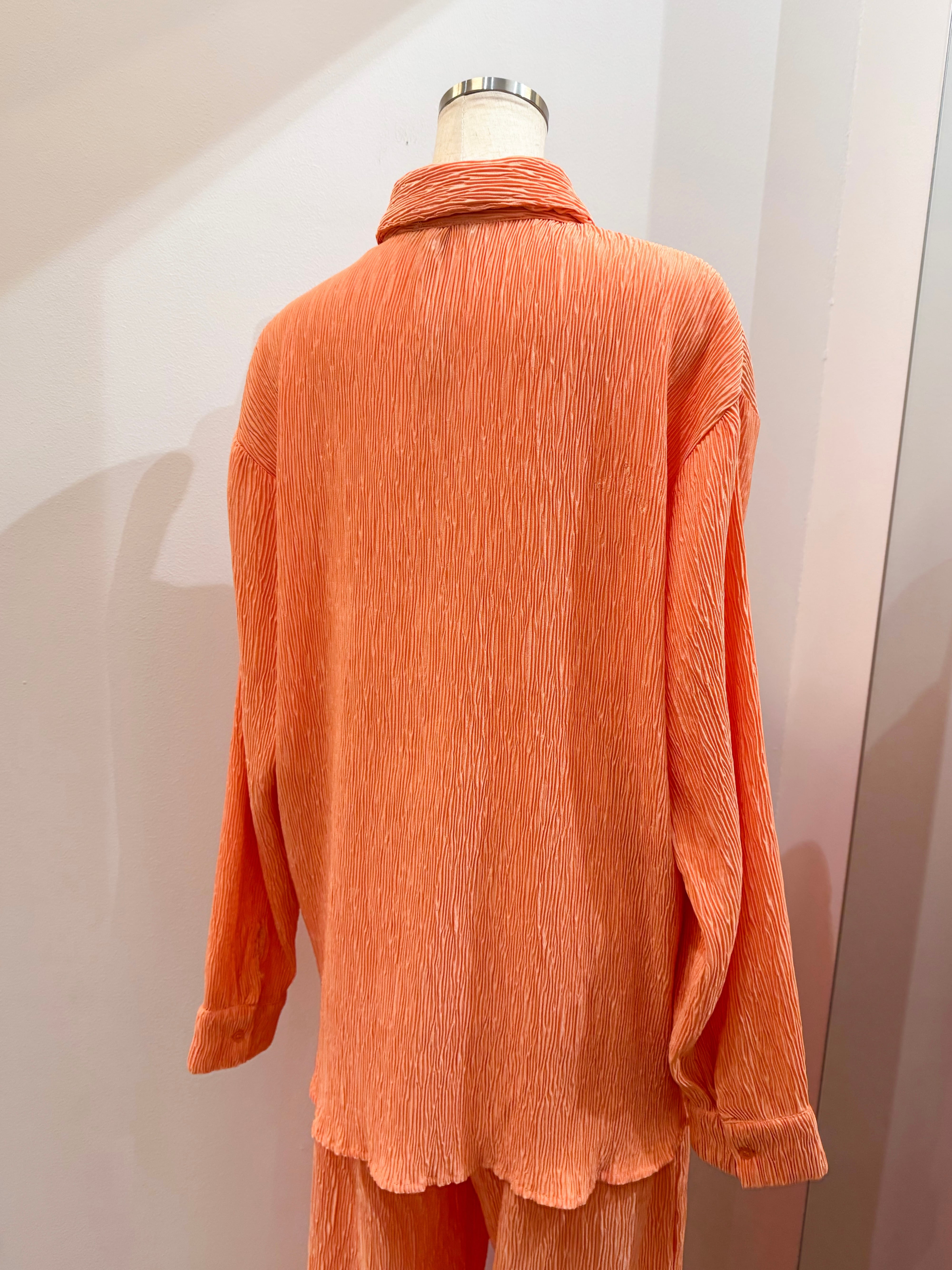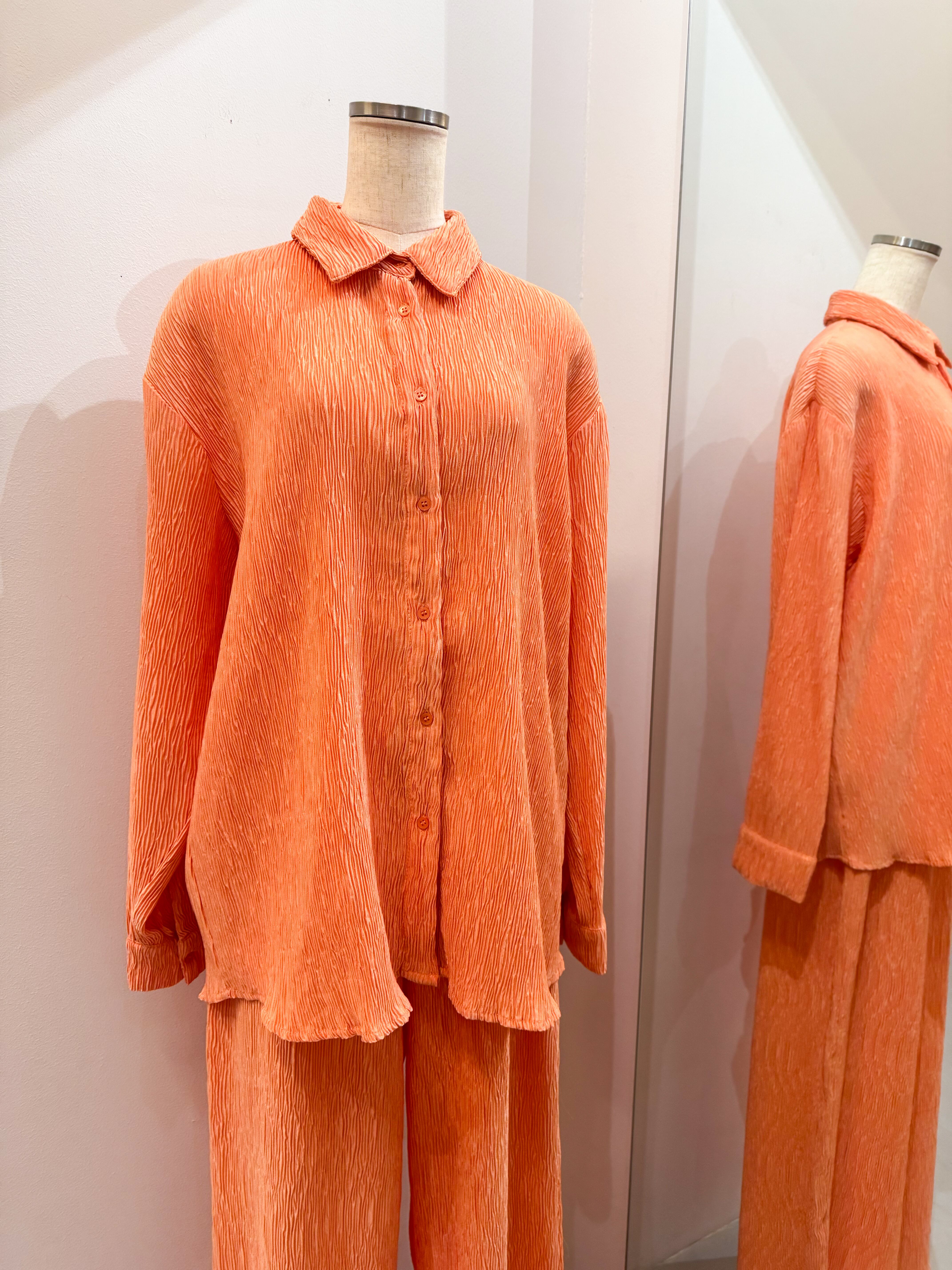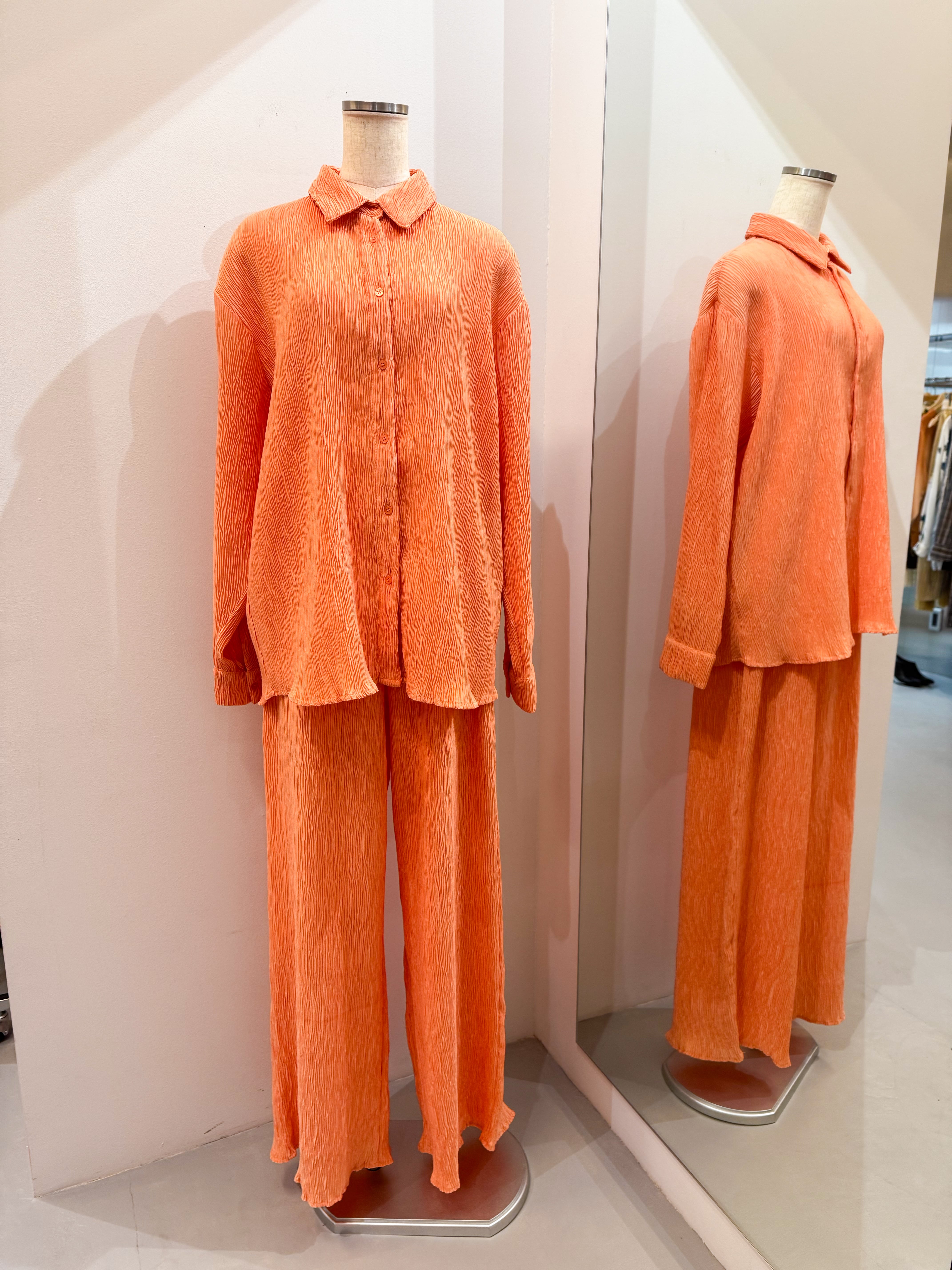 全体がオレンジ一色でまとめられており、装飾や切り替えのないシンプルなデザインだからこそ色の存在感が際立つ一着。この統一感のある雰囲気は、なかなか出会えない特別なものだと思います。