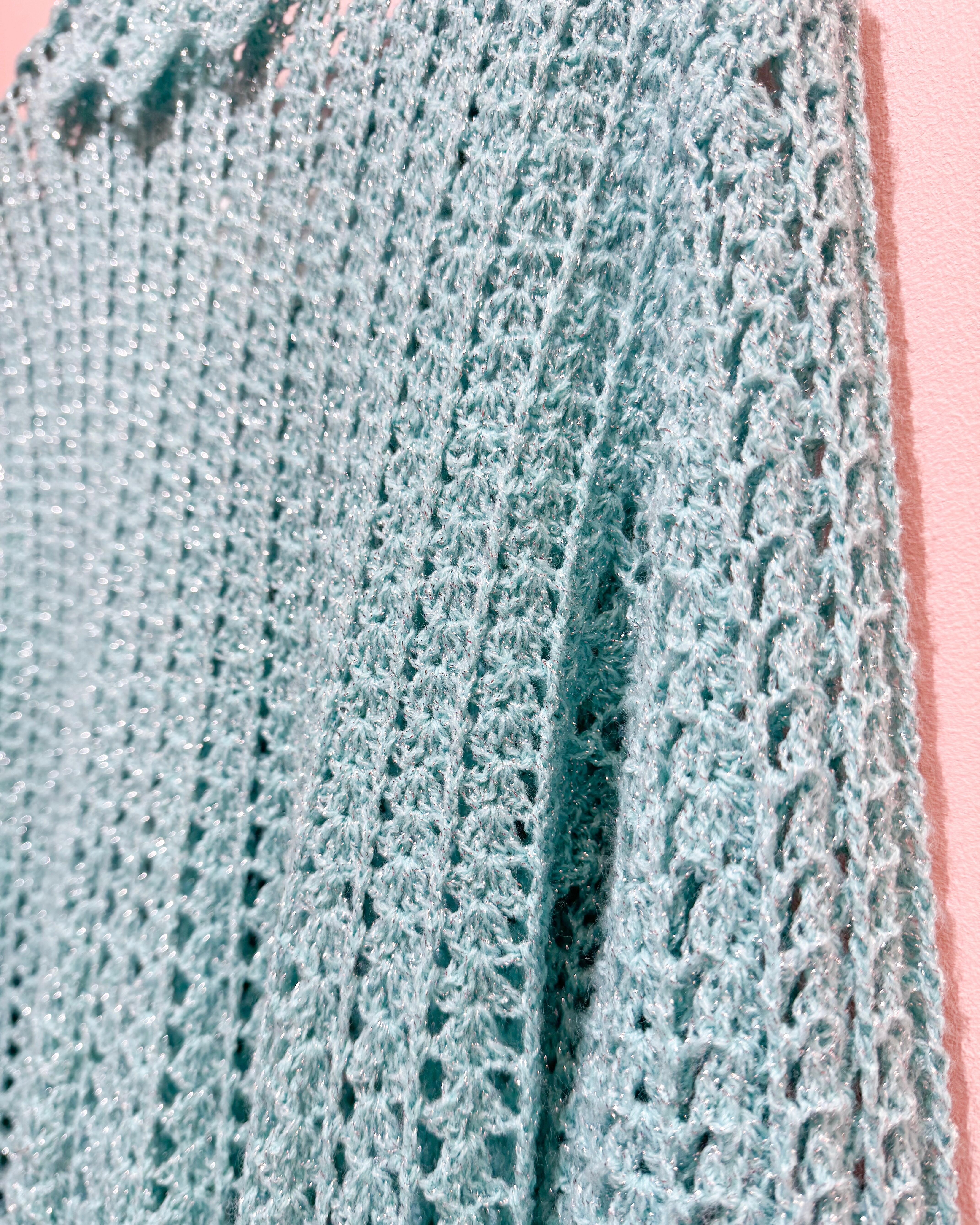 生地にはシルバーのラメ糸が織り込まれ、動くたびにさりげなく光ります。淡いトーンの中に優しい華やかさがあり、さまざまなスタイルにすっと馴染む一着です。
