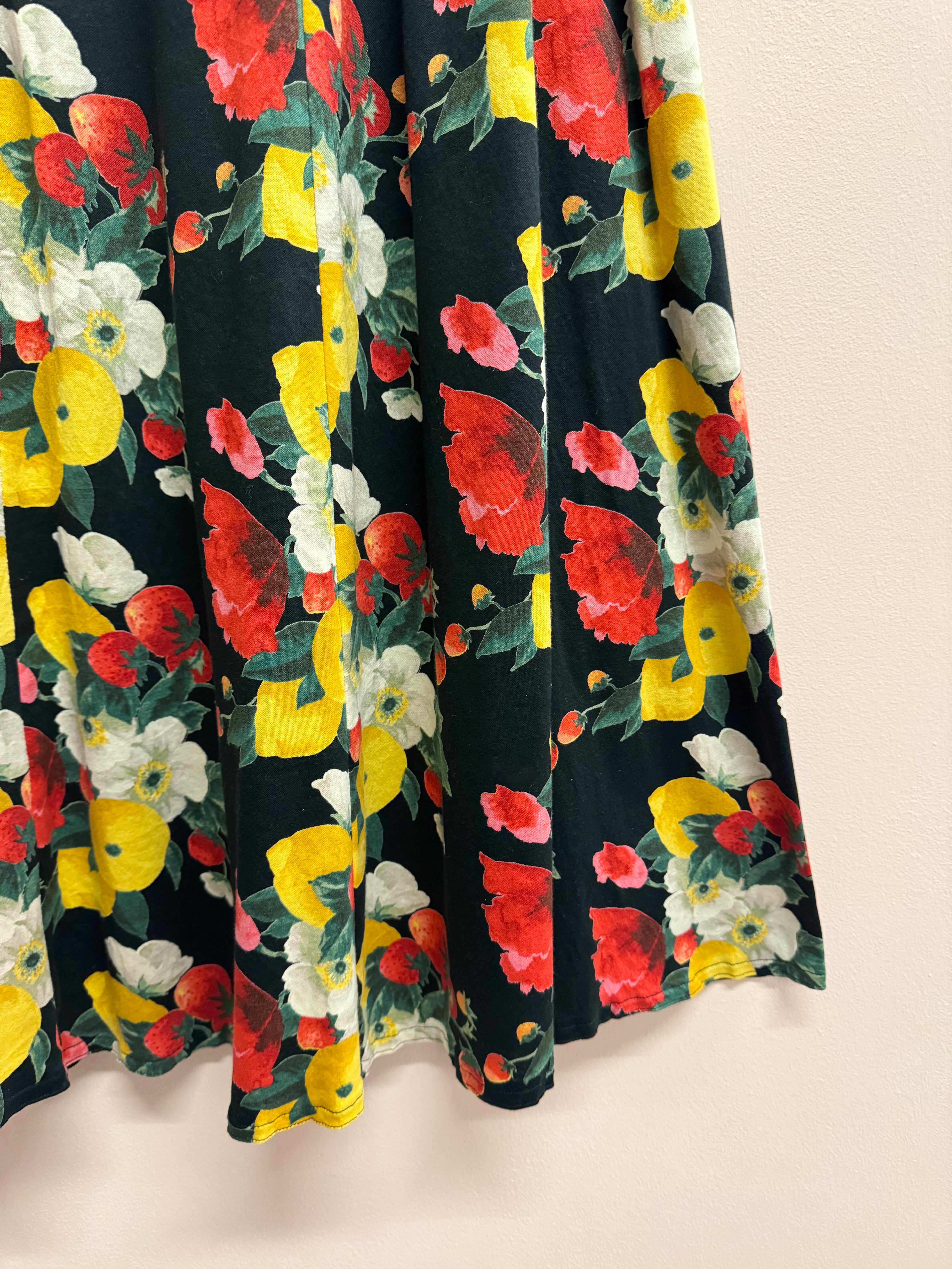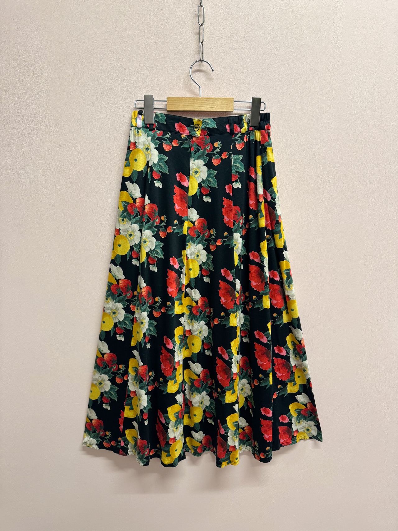 一見すると花柄のスカートのようですが、よく見ると苺やレモンなどのフルーツが描かれた、まるでアートのような1着。
