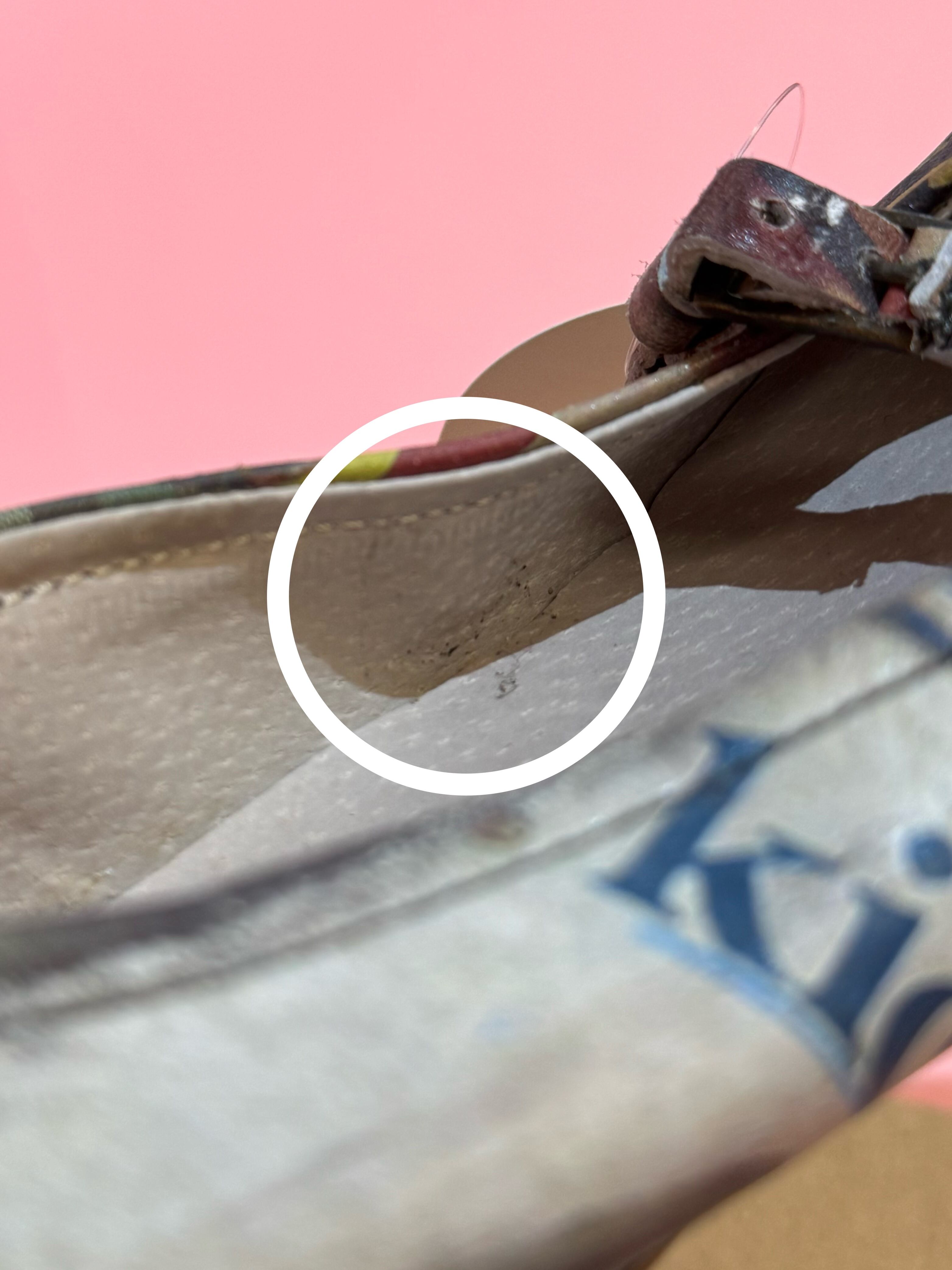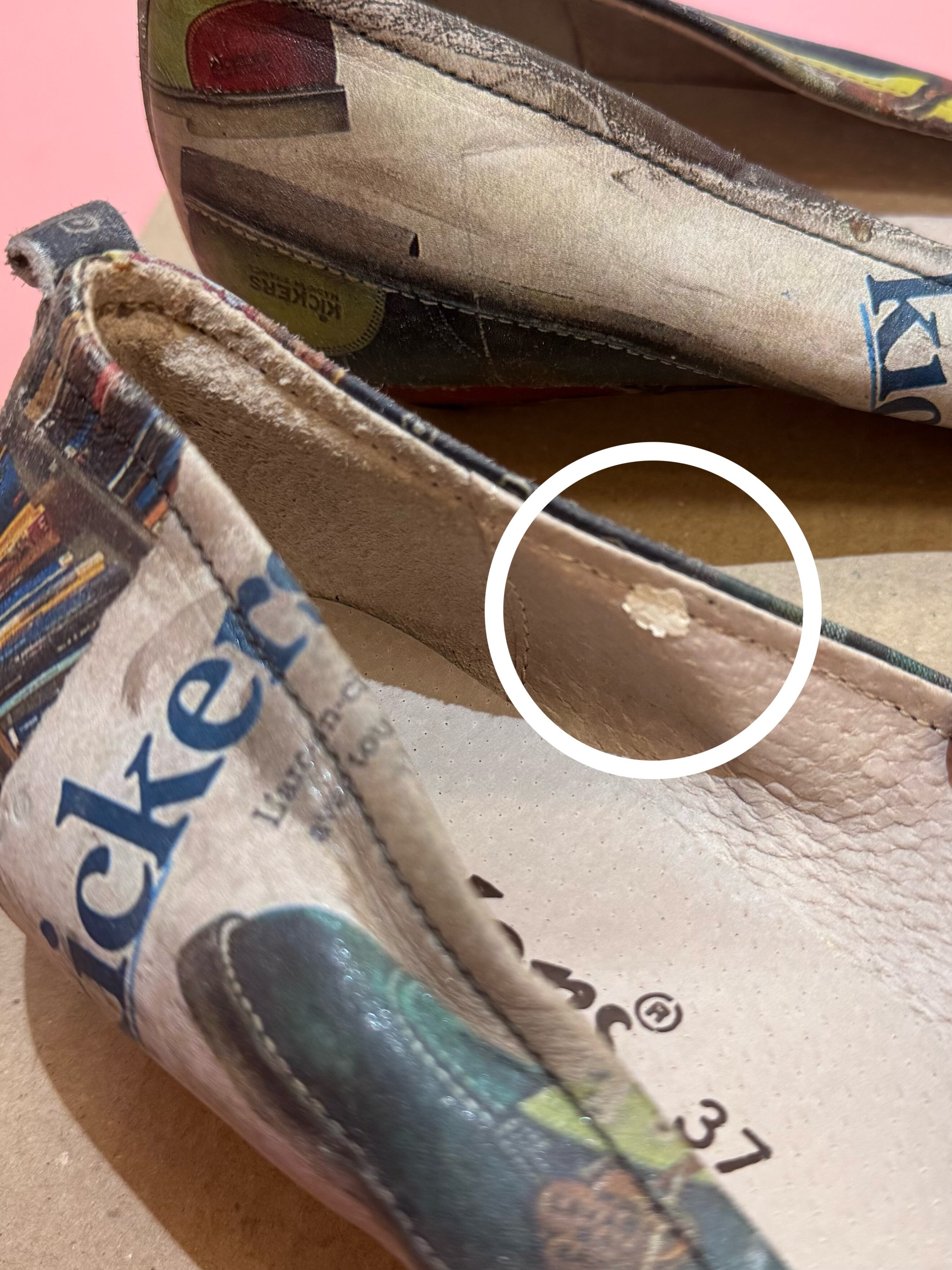 左足内側(写真18枚目)にはシール跡があり若干の粘着性が残っています。右足内側(写真19枚目)にはペンキのような跡があります。