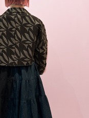 フロントにはボタンがなく常に開いた状態でのデザインとなっています。主張しすぎない程度の柄と落ち着いた色合いなので、他のアイテムを邪魔することなく自然に馴染みます。